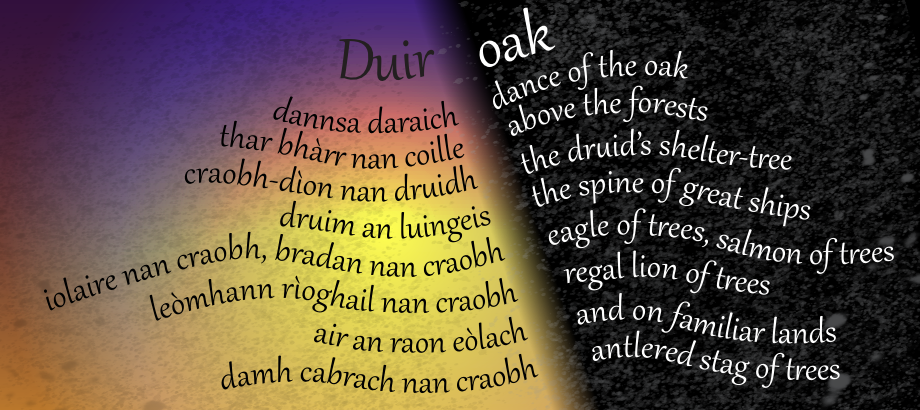 The word Duir (oak) means door, as does druid. A druid is therefore a doorman or guardian of the door. It is a door that looks both ways - and Duir/oak ends the first half of celtic year at midsummer solstice. A similar figure in Roman times is Janus, who is usually illustrated with two heads that look either way.