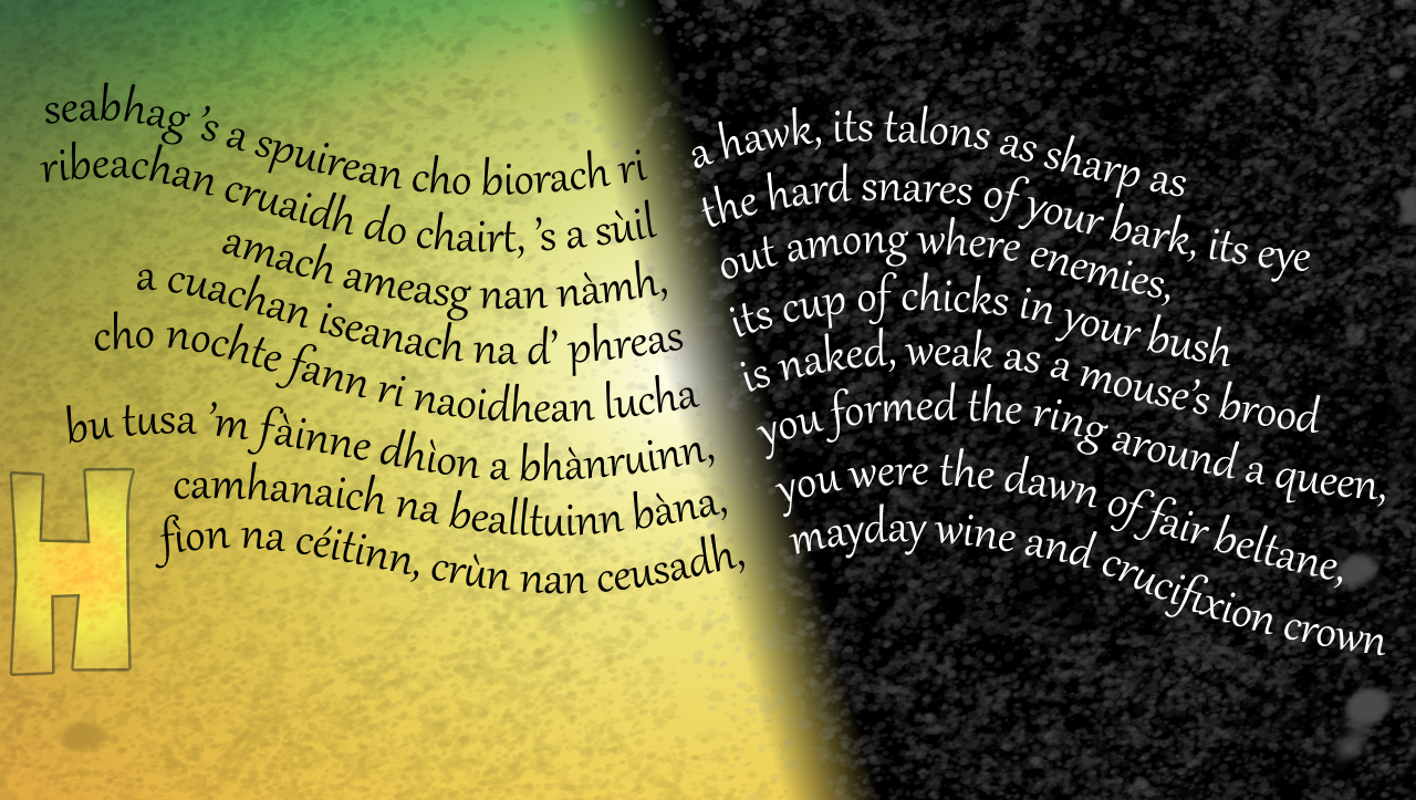 As well as reflecting ancient rituals of tasks set for bridegrooms and potential kings, Culhwych's tasks of finding the mystical Thirteen Treasures of Britain not only refer to his initation to kingship and marriage to the goddess, but also to the symbolism of thirteen, representing both the year (of thirteen months) and the resulting 'geis' of such acquired knowledge. For 'geis' is a strict code that has inherent invincibility coupled to binding conditions on those who accept it. Hard won delight is the gift of the May tree. And it is this that helps explain why a taboo existed about bringing it into the house, which by tradition, invited death (ie the giant) and was known as a bad month for marriage. This fine balance of geis is illustrated also in the ballad of Thomas the Rhymer, who, playing his harp by the the Eildon Tree, a hawthorn at Ercildoune, was taken away for seven years by the Queen of Elfland. She gave him his geis, the gift of prophecy, on condition that he never lied, which led to his becoming known as 'True Thomas'. The planetary balance on hawthorn is similarly dual, being described as 'Venus in Aries' by herbalists. Aries is controlled by Mars, so the prickly protective thorns can be seen as the Mars influence, while the influence of Venus is evident in the art, sexuality, beauty and flowers of hawthorn. Her bird is the raven